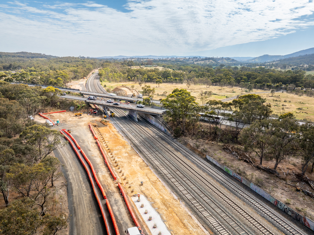 Work has ramped up significantly at the Tallarook and Seymour sites under the Hume Freeway, where the railway line will be lowered to accommodate double-stacked freight trains.