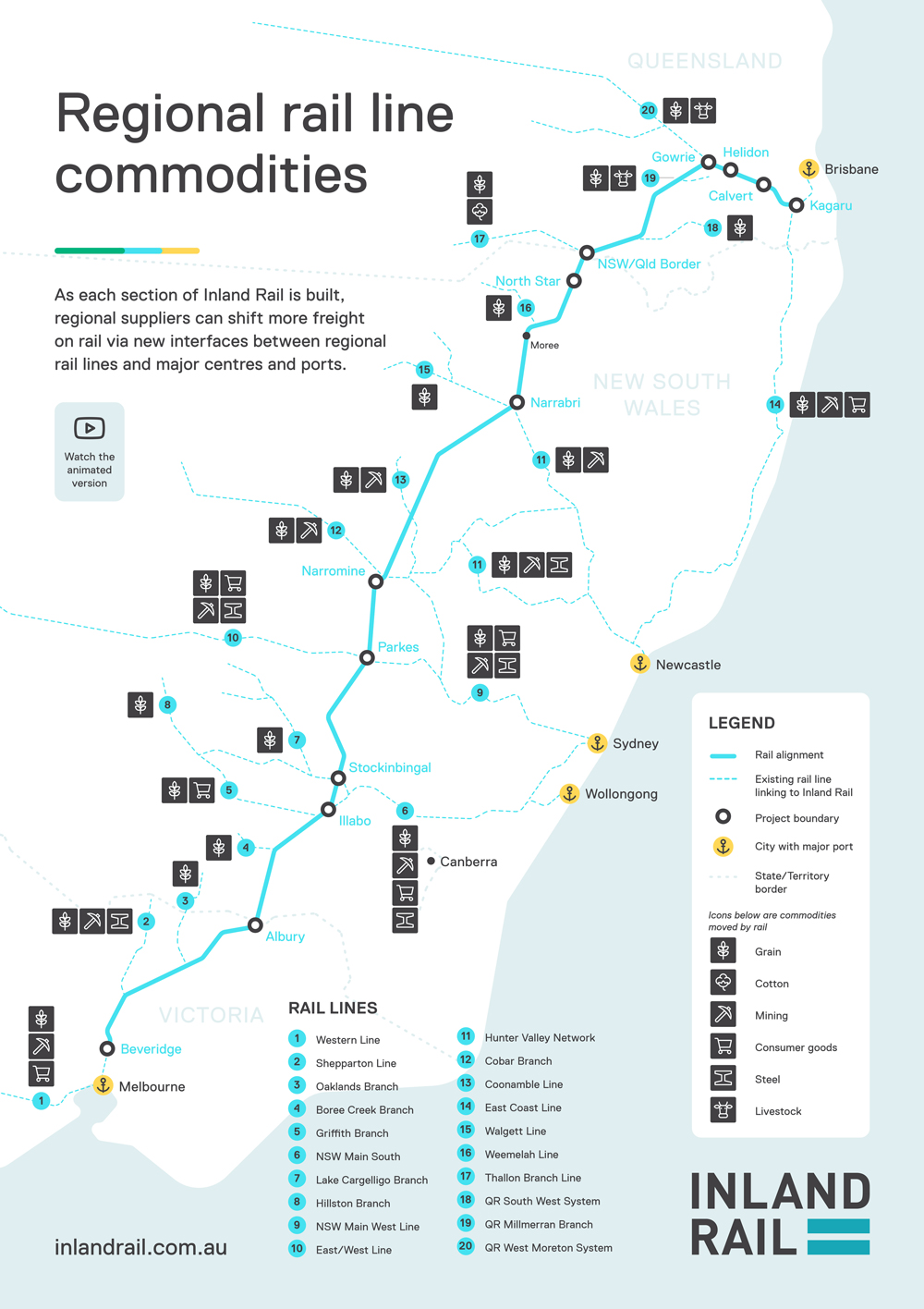 - Connections to regional and national freight networks providing for standard gauge connections to the ports of Melbourne, Port Kembla, Sydney, Newcastle, Brisbane, Adelaide and Perth