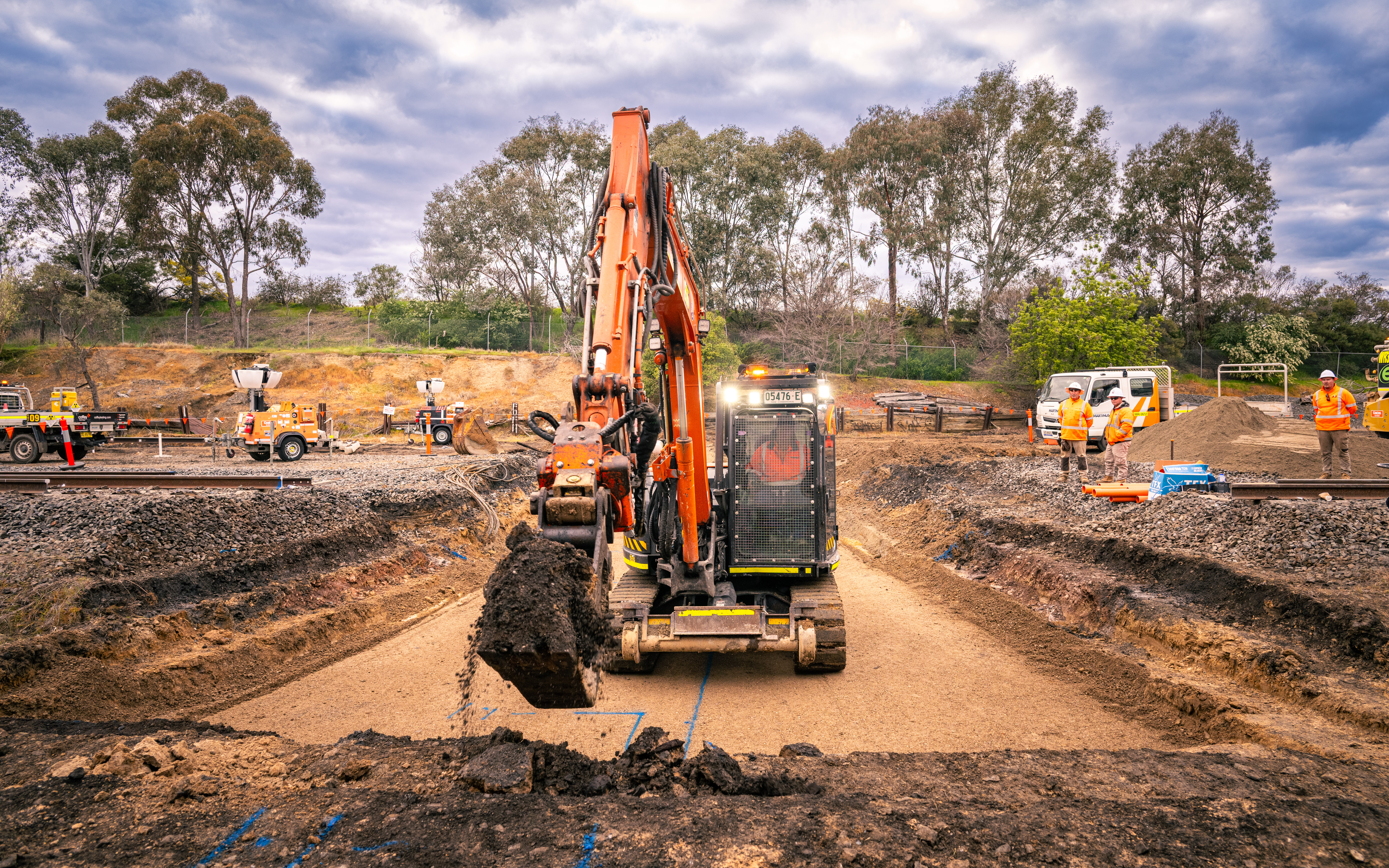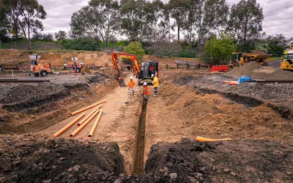 Works commenced at the Riverina Highway during the September 2025 track possession with the installation of new drainage pipes below the future dive site and re-routing conduits for signalling and communication cables.